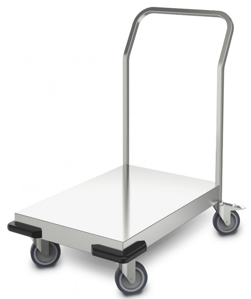 One-sided square tube push bar welded to the platform, ergonomically angled by 30°, ensures good manoeuvrability.